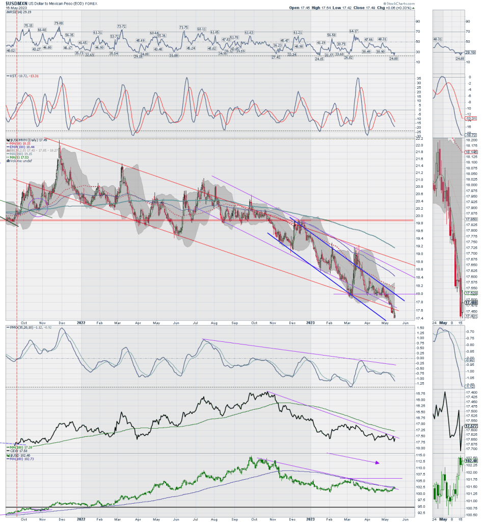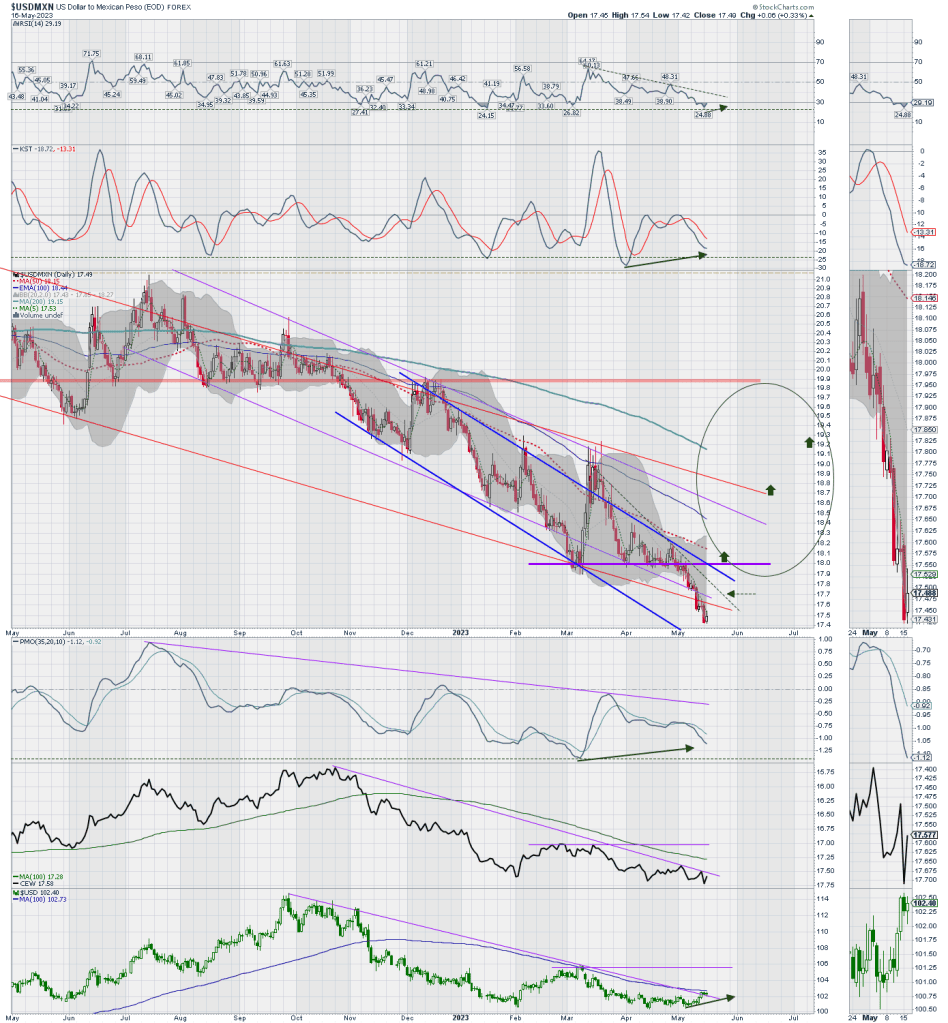 Así que desde cómo lo veo, un MXN arriba de 17.60 en los siguientes días y más aún arriba de 18 parecería que confirma su cambio de tendencia. Me gustaria ver divergencias en los osciladores que indico con flechas verdes los siguientes días para tener más información de que pierde fuerza. Ver que el Dólar empieza a subir así como el CEW (invertido) qué son las monedas emergentes. Acuérdate que cuando se devalúa casi siempre es RAPIDO asi que hay que actuar en cuanto se lleve esos niveles. Pero también se puede esperar un periodo menos violento y pensar que en las siguientes 4-6 semanas fluctúa entre los 17.50 y 17. Ya para el verano deberíamos de tener una definición de este cambio confirmado. Veremos!