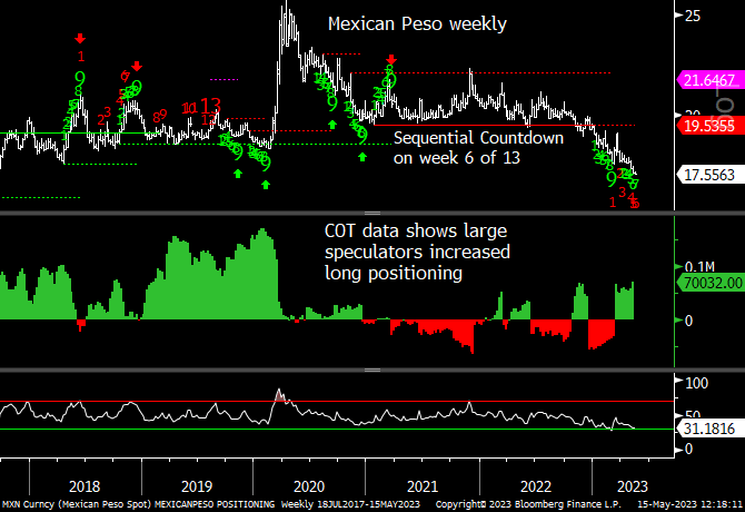 Además de tener un nivel de Sentimiento de lo mas complaciente y eufórico en el DSI de 80% (Daily Sentiment Index) y los especuladores muy largo el peso, es justo aquí en donde tomar la posición contraria a ellos puede ser muy redituable. Claro que no están en un extremo como en el 2019, pero lo suficiente para que si se empieza a devaluar salgan corriendo.