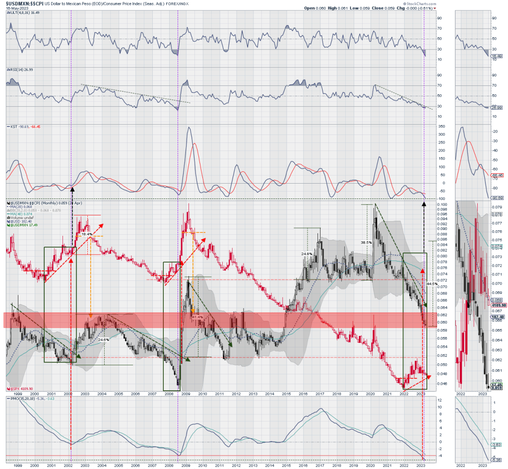 Pero todavía una señal un mas IMPORTANTE seria ver ese RISK OFF expresado en esta gráfica con el índice S&P500 en ROJO e Invertido subiendo para que entonces eso sí afecte al peso, puedes ver en los recuadros verdes como esta apreciación del peso ha pasado antes en el 2002 y en el 2008 haciendo divergencia con el índice accionario y SI justo antes de una recession. Por lo que el posicionamiento e implicaciones de esto es no es solo no estar en pesos si no fuera de los mercados accionarios también. (El peso en negro y deflactado por el CPI y osciladores estirados como pocas veces!)