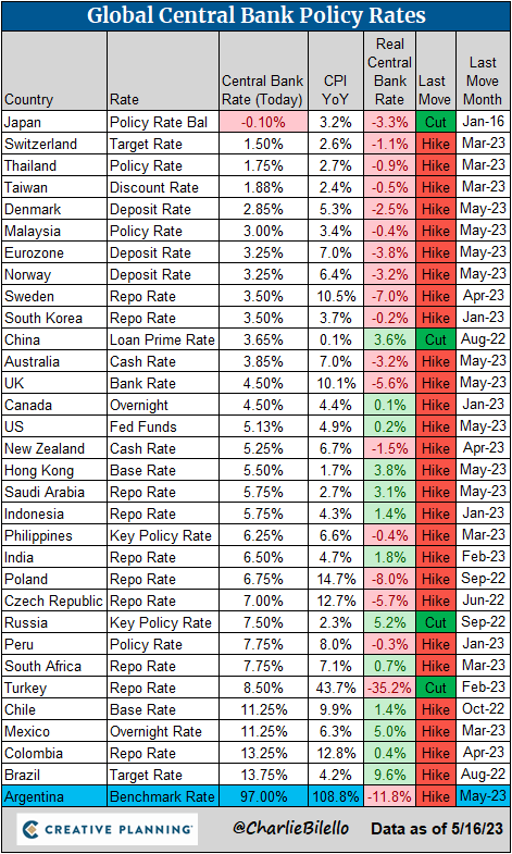 Cuales son los factores para que pase esto? Muchos, empezando por el que parece más probable, un evento de RISK OFF en donde a ningun inversionista le importa si le dan un 11%, o un 13% o un 15%, lo que quiere es su dinero de regreso en un lugar seguro (Dólares o Bonos Gub. de USA). El factor básico de esto es una típica recesión, pero claro como todo mundo ha hablado de esto desde el año pasado y nada mas no se da, pues ahora si cree que no se dará o será muy leve. Eso esta por verse, porque casi siempre las cosas tardan más de lo que uno cree… no porque no haya pasado significa que ya no pasará, pero poco a poco los datos nos van diciendo que es más probable. Parece que al MXN no le importa. Claro porque… se da mucho premio vs. otros países!, hablando de la tasa real. Ps. la inflación de Brasil yo no le creo mucho, pero fuera de esta y la de Rusia somo el pais que mas premio da!